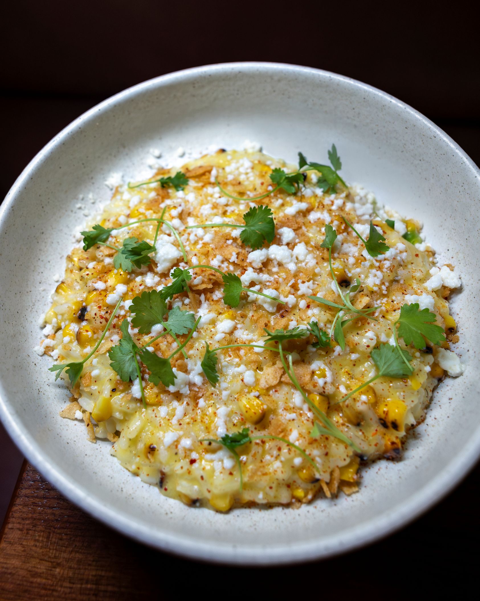 summer corn broth, roasted corn, cotija cheese, spiced corn crunch, lime zest, cilantro