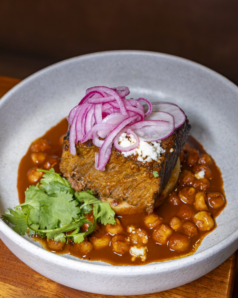 Chile consommé, roasted jalapeño masa, pickled onion, hominy, queso fresco, radish, cilantro.