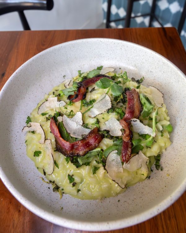 Murray family farms english peas, pea tendrils, parmesan cheese, scorzone truffle, house smoked lamb bacon